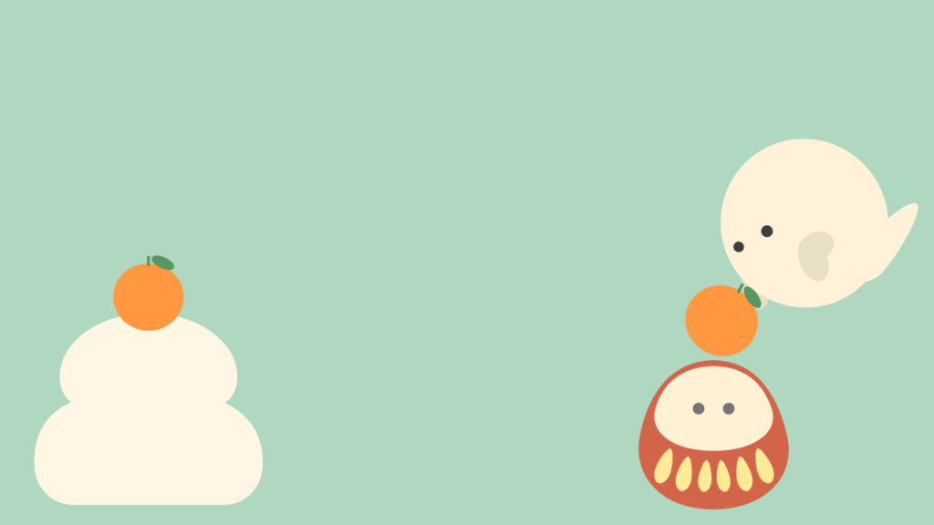 イラストのおはなし おばけのかんちがい|だいだいをのせた、ちいさなお正月のおはなし お正月、鏡餅の上にのっただいだいを見た、しろいおばけ。「うえにのせるもの」と勘違いして、だるまの頭にもだいだいをのせてしまいます。くすっと笑える、やさしいショートストーリーです。 2025.12.29 イラストのおはなし
