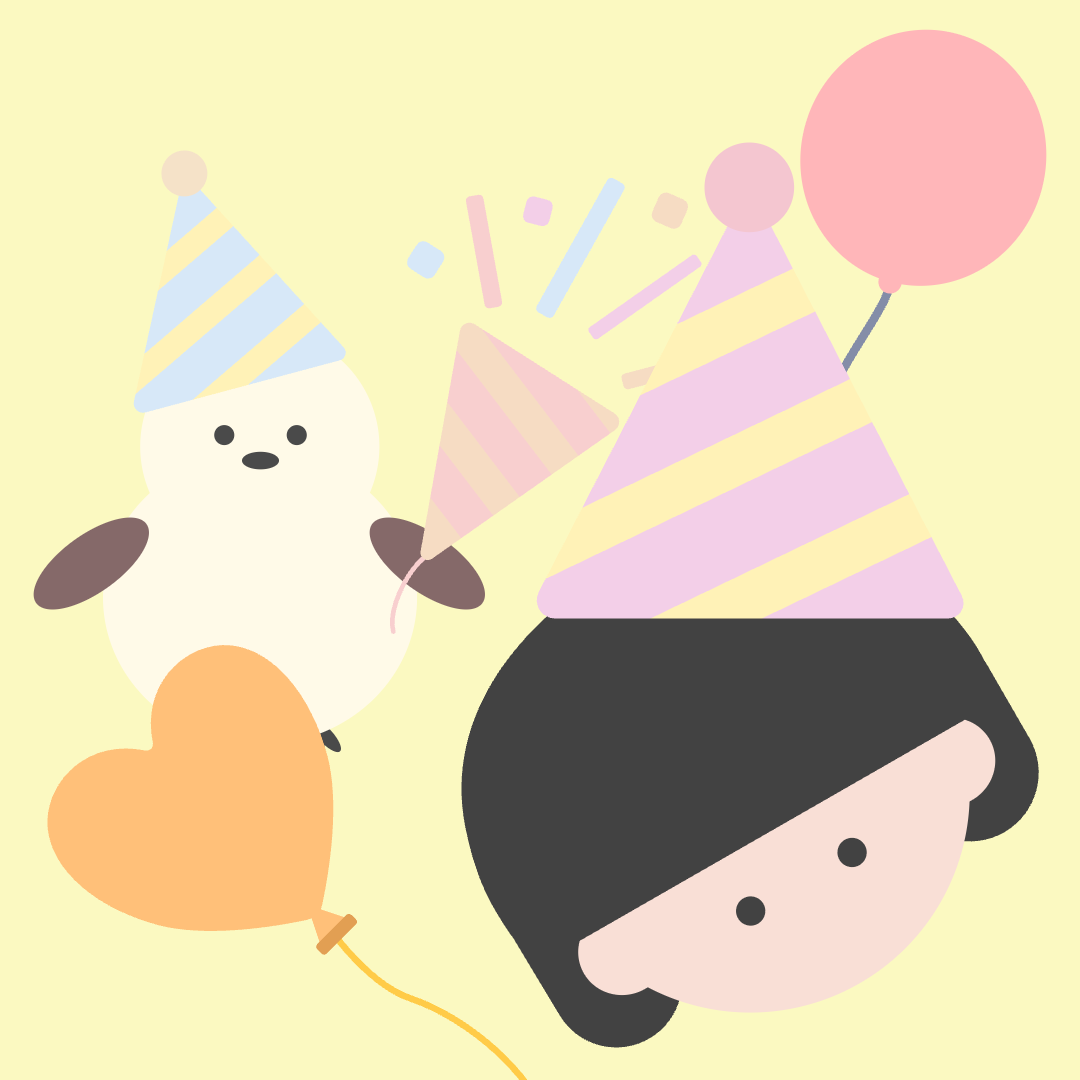 風船やクラッカーが散りばめられ、心温まるお祝いの瞬間が切り取られています。