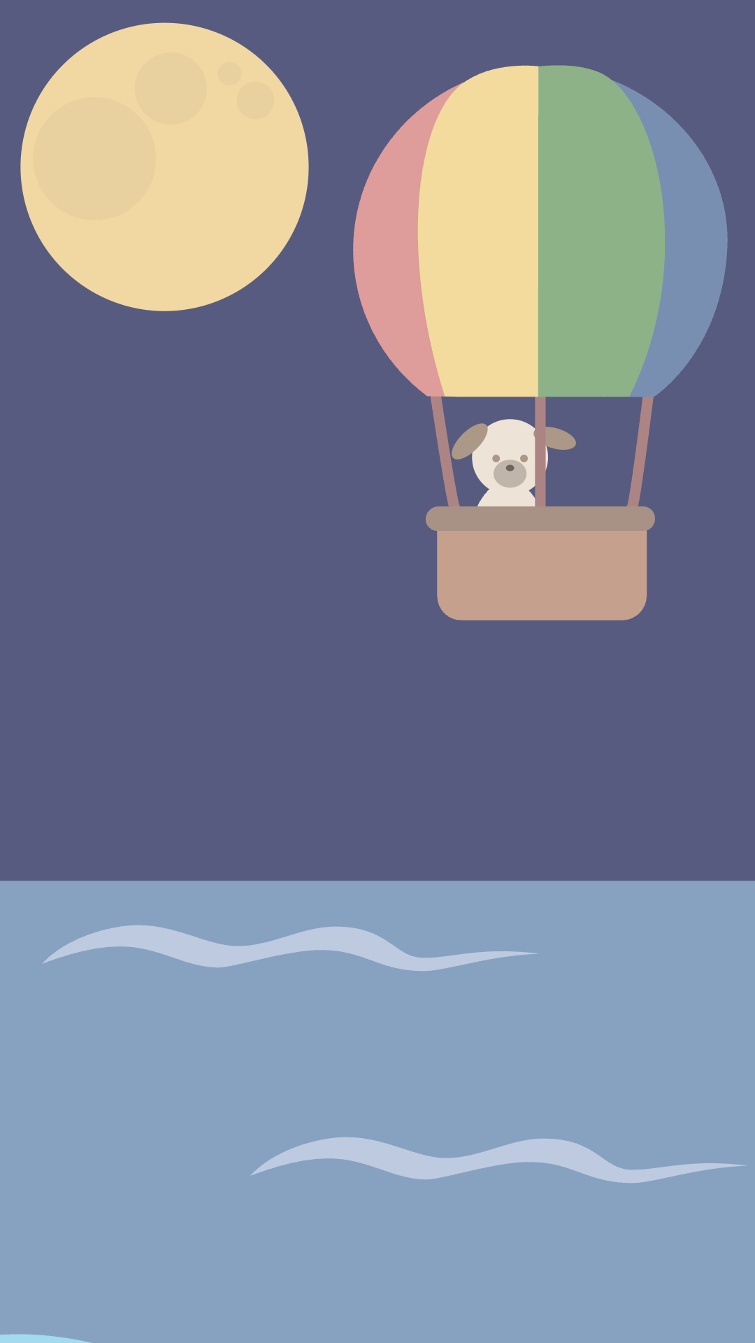 満月に照らされた夜空の下、気球に乗った愛犬が冒険の旅に出発します。