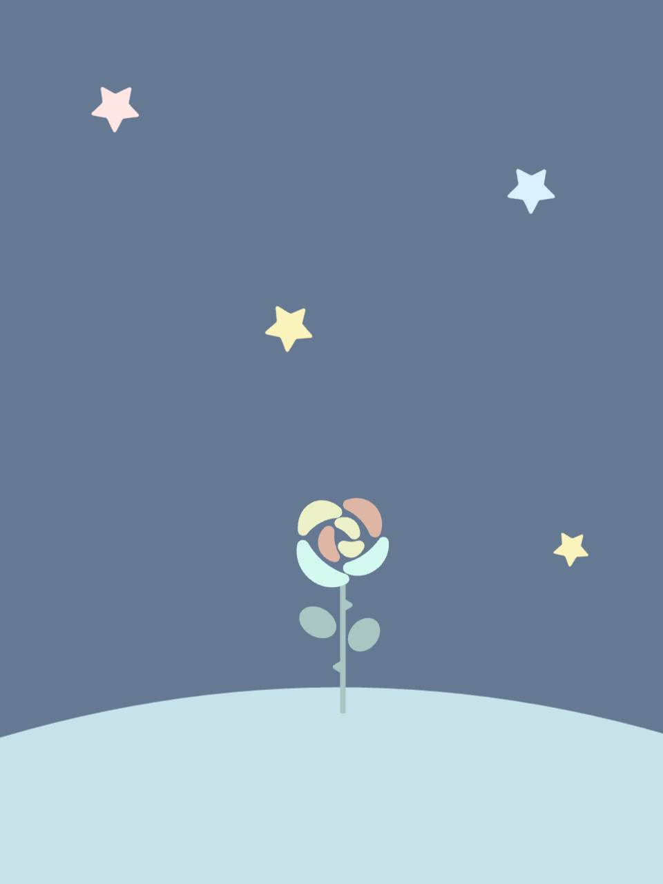 夜空に輝く星々と、一本の美しいバラが描かれています。 穏やかな丘の上に立つこの花は、幻想的な雰囲気を醸し出しています。 色合いは柔らかく、心を癒してくれる夢の世界へ誘います。