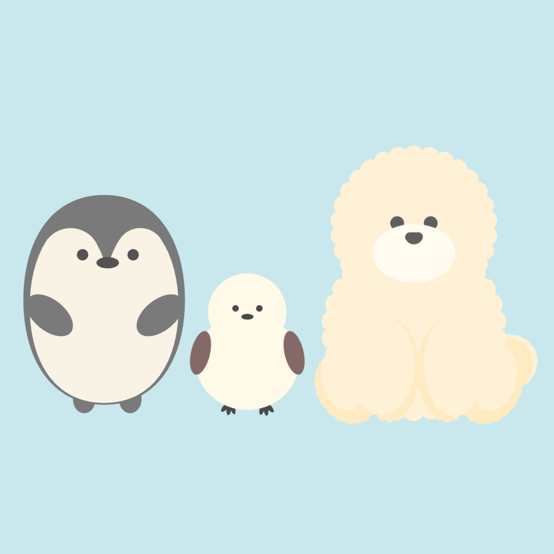 シマエナガと犬、ペンギンが仲良く並ぶ姿が愛らしい作品です。 柔らかい色合いとシンプルなデザインが、心温まる雰囲気を醸し出しています。 見ているだけで、優しい気持ちになれる世界観が広がっています。