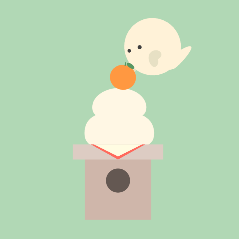 かわいらしいおばけが鏡餅の上にオレンジを乗せています。 柔らかな色合いとシンプルなデザインが、心温まる雰囲気を醸し出しています。 見る人を優しい気持ちにさせる、ほっこりした作品です。