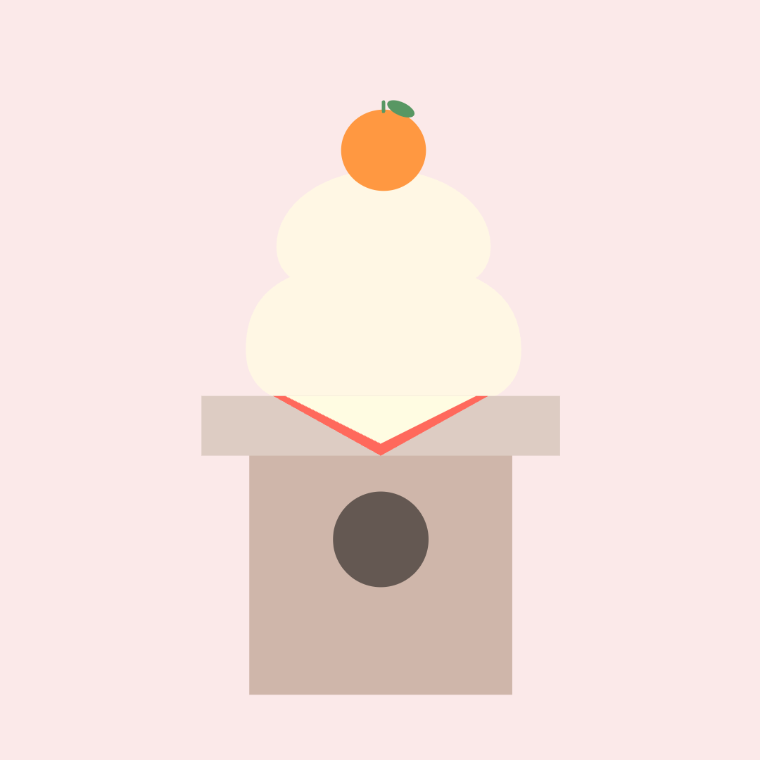 真っ白なお餅の上に、オレンジのたんかんがちょこんと乗っています。お餅くんは「これでみんなを幸せにできるかな?」と、わくわくしています。