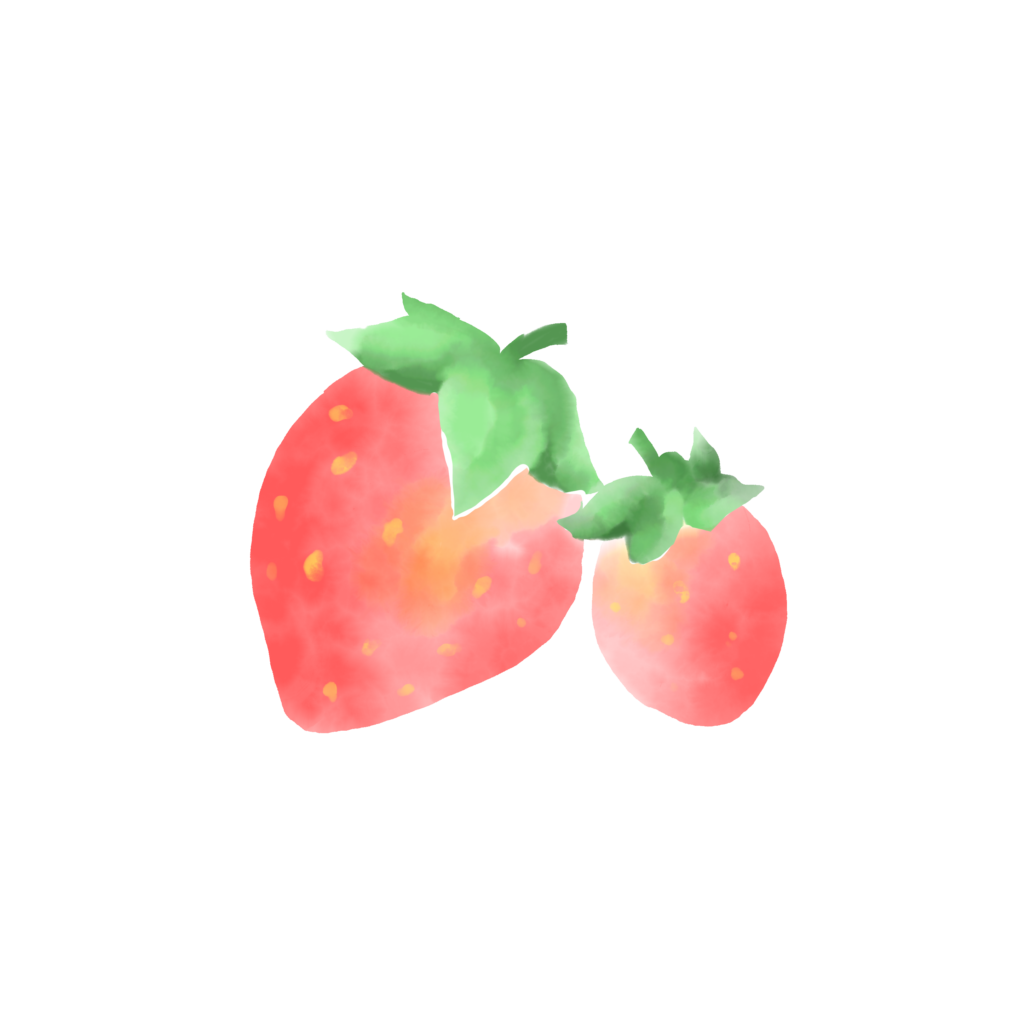 大きいイチゴと小さいイチゴが並んでいます。大きいイチゴは少し自信満々で、「私はみんなの人気者!」と思っています。小さいイチゴは、「私ももっと大きくなりたいな」と少し恥ずかしそうです。でも、一緒にいると心がぽかぽかして、二人はとても幸せな気持ちです。