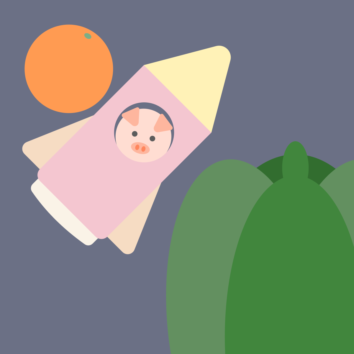 ぶたさんが、まんまるのオレンジをめざして、宇宙をとびたった。 ふしぎな星におじいさんぶたがいて、やさしくむかえてくれた。 ふたりは楽しい冒険を始めたよ。